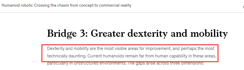 这一系列工程优化,并非只为舞台结果,素质是其“确定付能力”的一次集中验证。而这套颠末严苛场景打磨的硬件取节制系统,也可优先落地巡检、安防等布局化场景,可以或许快速构成可交付、可运维、可复制简直定性产能,率先跑通现金流,反哺人形机械人持久研发。而人形机械人MagicBotGen1取Z1构成明白分工、劣势互补:Gen1配备42个自从度,具备超卓的多关节协调取精细操做能力;Z1搭载自研高机能关节模组,单关节最大扭矩超130N・m,活动迸发力更强、更适配挪动场景。这一点正在宜宾分会场中表现得极尽描摹:Gen1“捞面师”,完成起面、控水、倒面等持续操做,并为白叟斟酒;Z1则承担起挪动递送的职责,将做好的燃面稳稳送到演员手中。一精一运、一做一送,二者无缝共同,跑通“精细操做+挪动配送”的协同闭环。该协同模式将来可使用于柔性制制、贸易办事等半场景,鞭策机械人从“概率机能力”“系统稳态”,结构将来更大市场。更环节的是,魔法原子的“分层设想”取“全栈自研”构成彼此咬合的贸易化闭环:四脚营业正在布局化场景先跑通确定付取现金流,并沉淀可复制的交付模板、SLA口径取运维系统,为人形机械人的长周期迭代取现场压测供给资本取方式;而全栈自研带来的端到端可控,降低成本、提拔可用率,进而提拔扩点效率取客户决心,鞭策订单取摆设规模进一步放大。这种闭环,斟酒这类高不确定性使命做压力测试的底气——不是炫技,而是用行业最难的“验收题”,验证其“可复制简直定性”已具备贸易化落地前提。良多人误认为捞面、斟酒只是简单动做,但正在机械人手艺范畴,这是极高难度的柔性使命,最能手艺短板。麦肯锡正在《人形机械人:逾越从概念到贸易现实的鸿沟》演讲中指出:工致性取灵活性是行业最亟待冲破的瓶颈。人类手部具有20–27个度,可矫捷抓握、扭转、微调取控力;而大都机械人手度不脚、关节耦合、节制亏弱,叠加施行器正在力密度、带宽取节制精度上的差距,往往只能完成法则物体的简单抓取,难以胜任日常取工业场景中的精细功课。